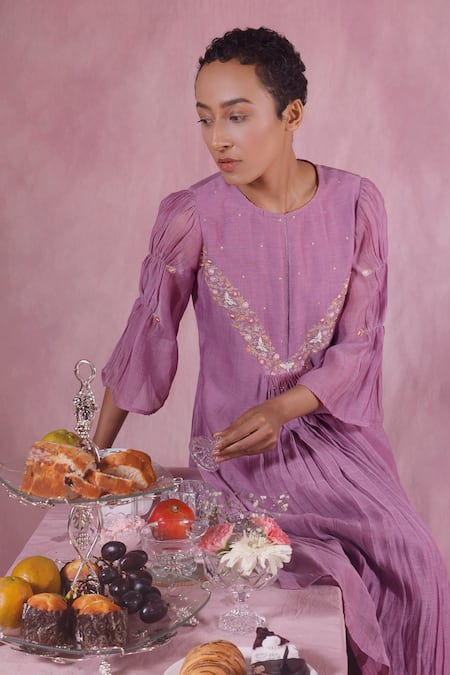 Lilac gathered kurta with floral & fly embroidered motifs. Paired with straight fit pant.