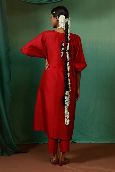 Red silk kurta featuring a notched round neck, dolman sleeves, and intricate sequin, zari, thread, and bead work on the yoke. Paired with straight pants and an inner slip, the kurta includes side high slits and beaded hem details.