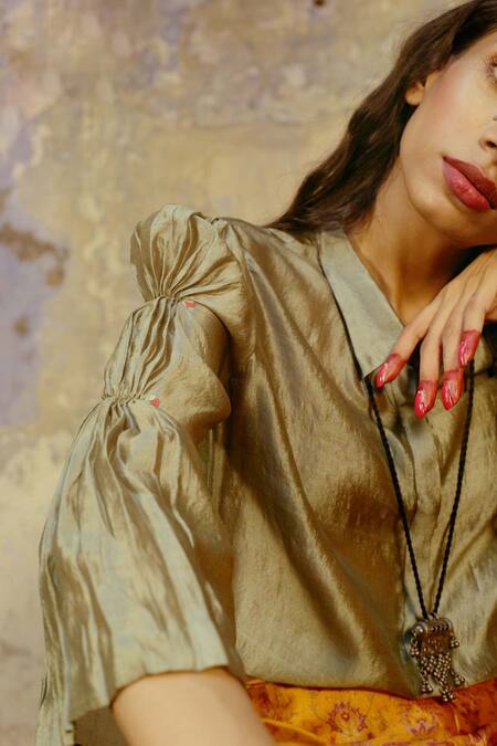Shop_Chokhi Chorri_Green Handwoven Silk Shirt Collar  _at_Aza_Fashions