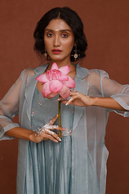Blue Dress Chanderi, Jacket Organza Floral, Indu Embroidered With