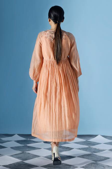 Coral peachish orange midi dress featuring balloon sleeves and a round neckline. Adorned with blossom applique and aari embroidery on the yoke, it comes with an inner layer.