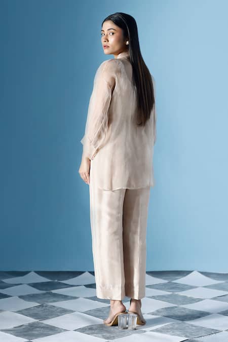 Beige silk jumpsuit featuring a round neckline and sleeveless design. Paired with an organza shirt adorned with bloom embroidery and kantha stitch details, complemented by full sleeves.