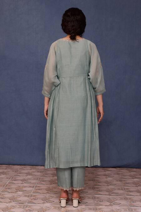 Floral embroidery on neckline and sleeves, Gathered detailing on the anarkali, Cutwork embroidered hem on pant