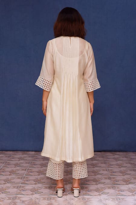 Off White Kurta Silk Chanderi Cutwork Mosaic Round Neck Mahsa With Pant