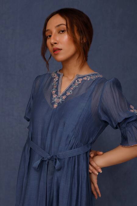 Blue dress featuring floral embroidery on the neckline and sleeves