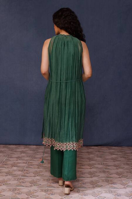 Green sleeveless kurta in malai cotton featuring floral cutwork embroidered yoke. Paired with silk pant adorned with thread embroidery and tassel detailing.