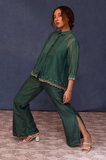 Green sheer sleeve shirt featuring pintuck detailing, sequin embellished yoke, and floral cutwork embroidered hemline. Paired with a side slit pant in silk fabric.