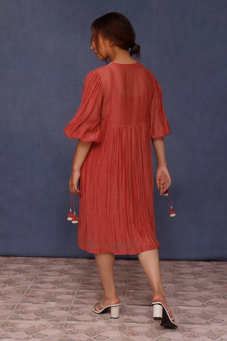 Red Cotton Beads Open Neck Nika Embroidered Yoke Dress