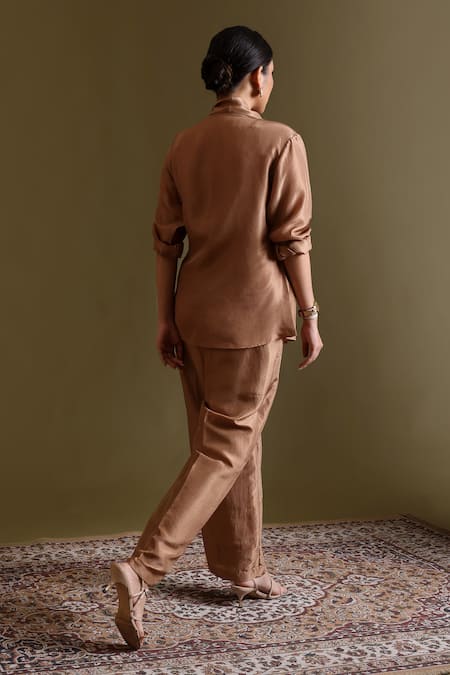 Beige Silk, Dupion Cowl Neck Nitya Overlap Top And Pant Set