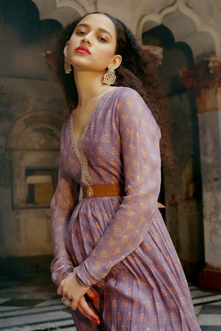 Buy_Chokhi Chorri_Purple Malai Chanderi V Neck Printed Maxi Dress With Belt _at_Aza_Fashions