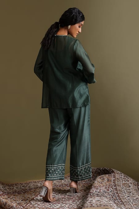 Buy_Chokhi Chorri_Green Chanderi Silk, Dupion Embroidery Round Neck Rajat Short Kurta With Pant _Online_at_Aza_Fashions