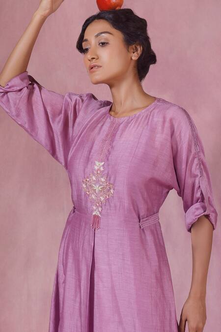 Buy_Chokhi Chorri_Purple Mulberry Silk Embroidery Floral Motifs Round Rolled Up Sleeve Kurta_at_Aza_Fashions