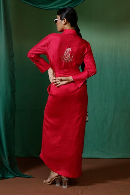 Hot pink silk shirt featuring a collar neckline and full cuff sleeves with intricate paisley pattern embroidery. Paired with a pleated draped skirt and an embroidered belt.