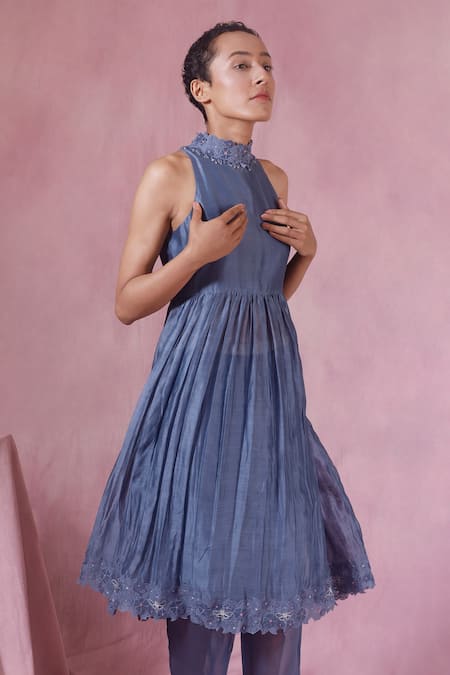 Blue silk chanderi anarkali with floral embroidered collar. Paired with half silk half net pant.