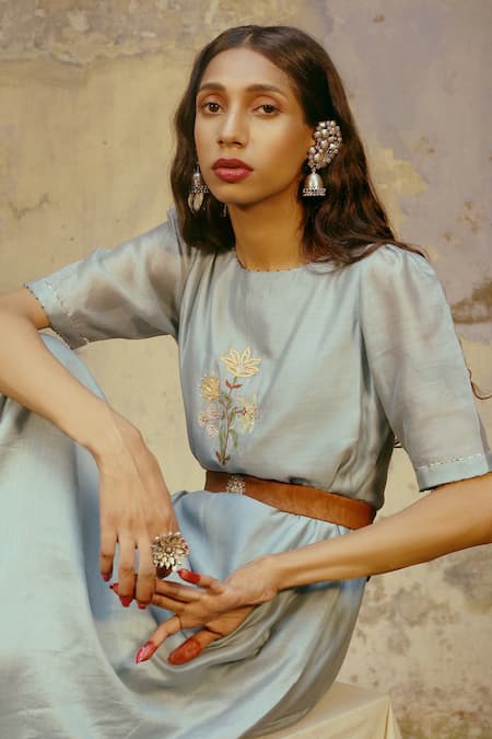 Powder blue maxi dress with floral embroidered motifs. Paired with faux leather belt.
