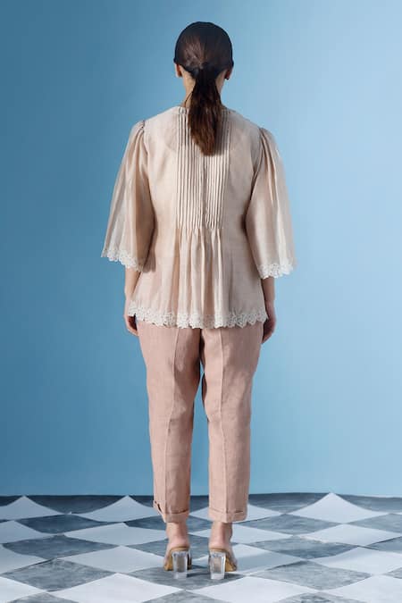 Beige Chanderi, Linen Beads Thira Pintucked Yoke Bloom Embroidered Top Pant Set