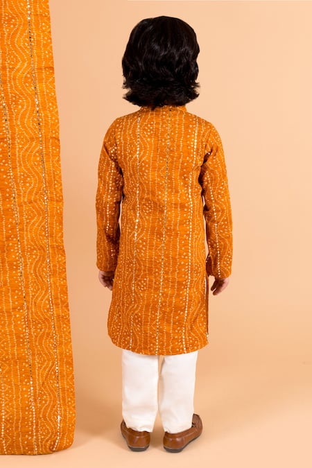 Mustard yellow kurta featuring bandhani print, mandarin collar & faux mirror work. Paired with matching cotton lycra pant.