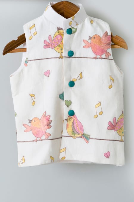 Off white cotton bundi featuring multi-color bird embroidered motifs. Paired with a cotton full sleeves kurta and pant.