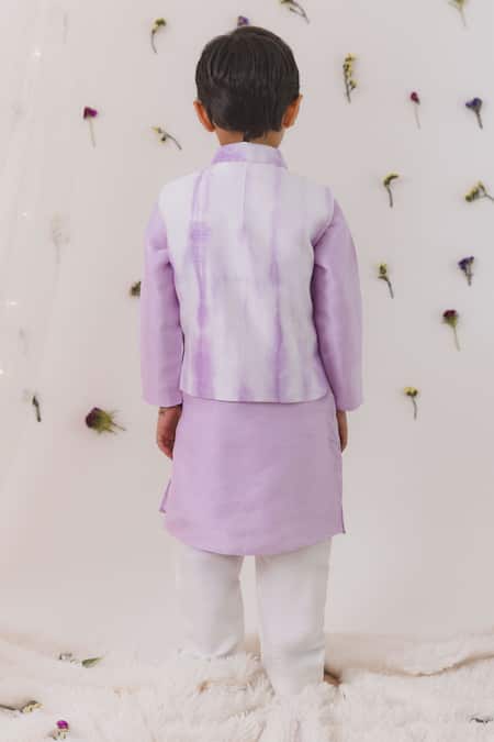 Lilac silk bundi featuring tie dye patterns with a mandarin collar. Paired with a plain kurta and pant, all in silk fabric with organza lining.