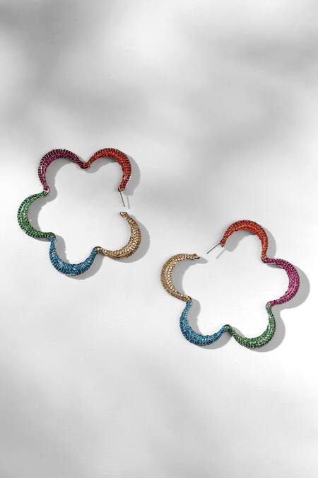 Multicolor hoop earrings featuring cubic zircon embellishments and a unique five petal monogram design