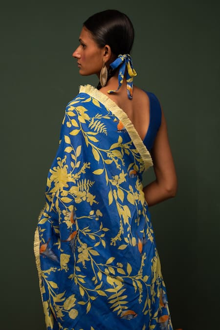 Blue chanderi silk saree with floral print & fringe lace border. Comes with unstitched blouse.