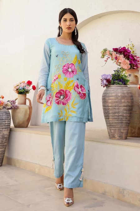 Buy_Chrkha_Blue Cotton Satin, Chanderi Floral Honeycomb Print Embroidered Kurta Pant Set _Online_at_Aza_Fashions