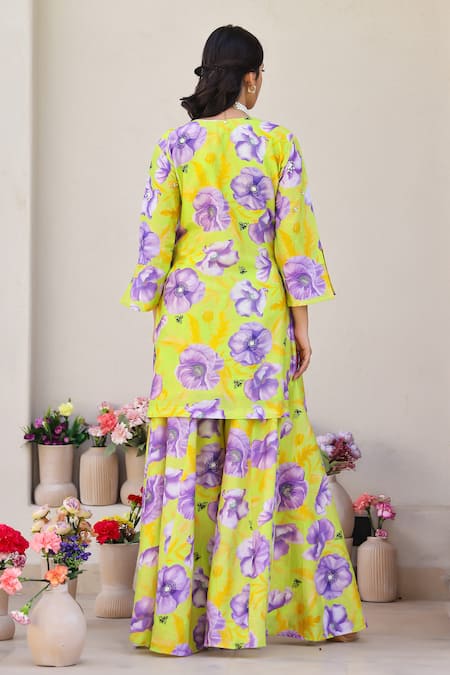 Buy_Chrkha_Green Cotton Satin, Chanderi Silk Floral Print Embroidered Kurta Flared Pant Set