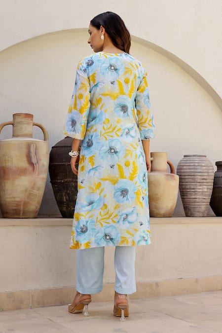 Blue Chanderi Silk, Linen Embroidery, Sequins, Floral Print Kurta Pant Set