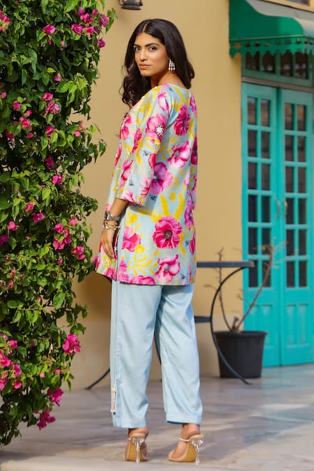 Shop_Chrkha_Green Cotton Satin, Chanderi Silk, Linen Beads, Floral Print Kurta Pant Set _at_Aza_Fashions
