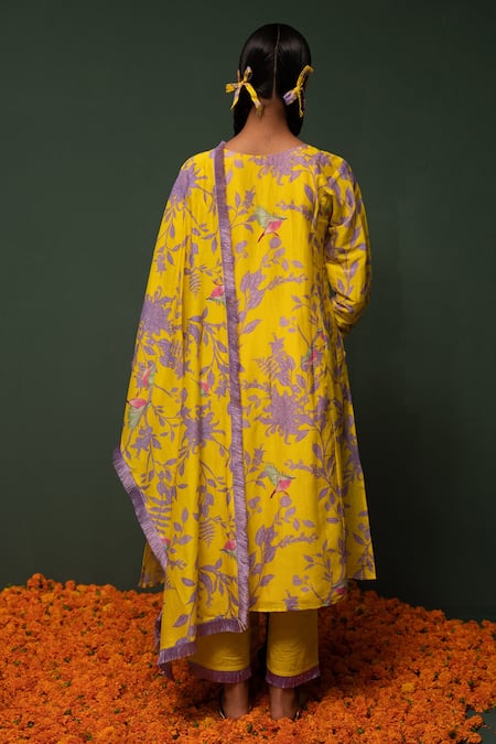 Yellow chanderi silk kurta with floral & bird print. Paired with cotton pant & dupatta.
