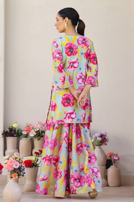 Blue kurta featuring a V-neck, three-quarter sleeves, and floral embellishments with sequin and bead accents. Paired with a matching printed sharara and gota border dupatta.