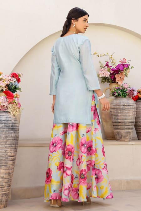 Blue kurta featuring floral and honeycomb print with sequin and bead embellishments. Paired with a matching printed sharara in vibrant colors.