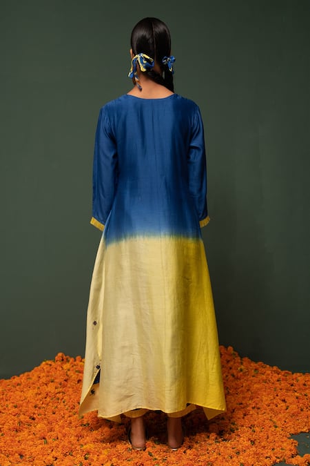 Blue, yellow ombre kurta with placement floral embroidered motifs and keyhole cutout in front. Comes with straight pants and printed dupatta.