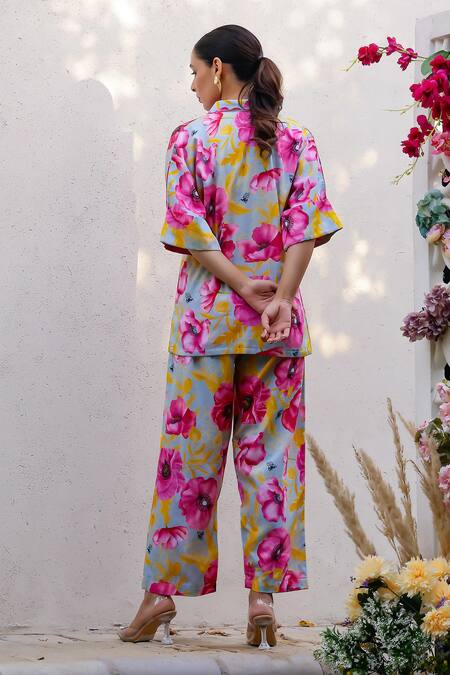 Buy_Chrkha_Blue Cotton Satin Printed Floral Collared Shirt And Pant Set