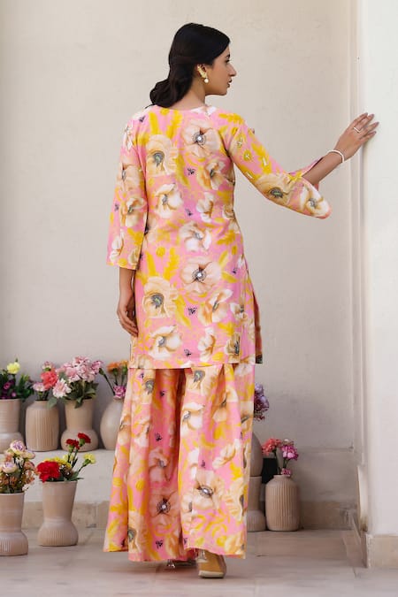 Pink kurta featuring floral and honeycomb print with sequin and bead embellishments. Paired with a matching printed sharara and gota border dupatta.