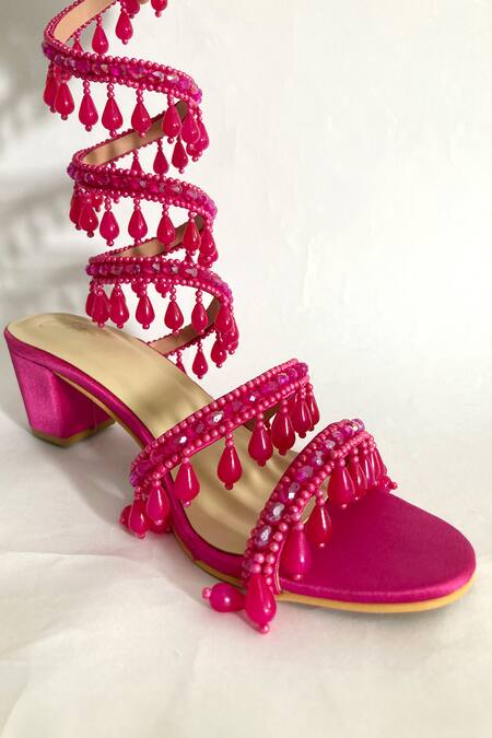 Pink spiral heels featuring a crystal and pearl drop embellished strap