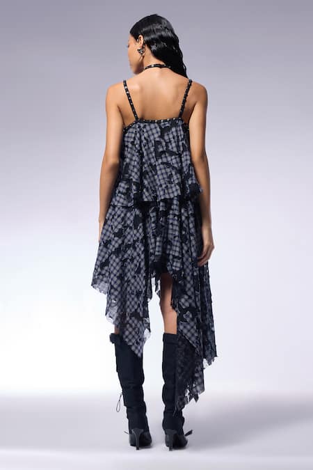 Buy_Cilvr_Blue Cotton, Polyester Halter Neck Deconstructed Layered Checkered Dress