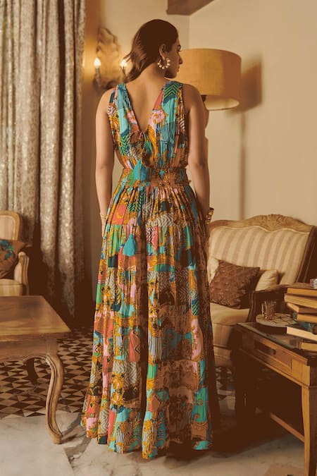 Multicolor abstract ornamental printed maxi dress with a smocked waist