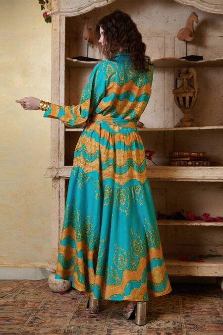 Teal green maxi dress featuring abstract print with bead and cutdana embroidered collar