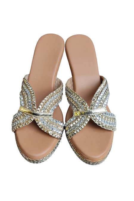 Beige embroidered wedges featuring braided detailing and open toe design