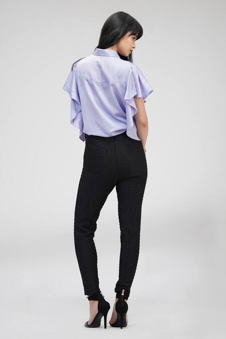 Lavender shirt featuring circular ruffle sleeves and a spread collar
