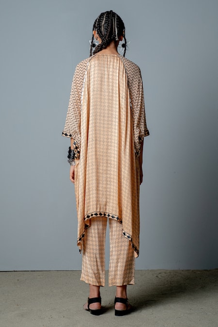 Beige geometric printed kaftan with hand embroidered detail. Paired with printed pant.