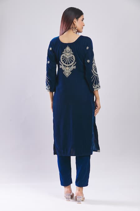 Buy_Samyukta Singhania_Teal Velvet Embroidery Round Neck Kurta Set With Dupatta