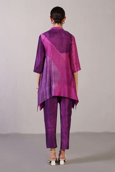 Pink & purple dupion silk kurta featuring a flowna pattern with dot embellishments and an asymmetric hem. Paired with coordinating purple dupion silk pants.