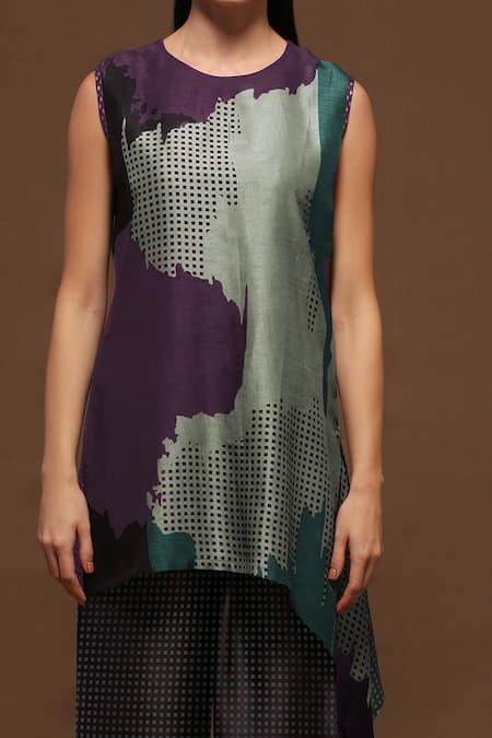 English walnut kurta with geometric printed motifs and asymmetrical hem. Comes with straight pants.