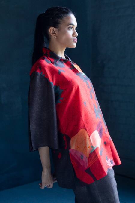 Red, black shirt tunic with geometric abstract print. Paired with printed pant.