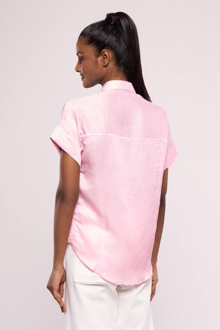 Pink shirt featuring short sleeves, shirt collar, and embroidered cloud motifs