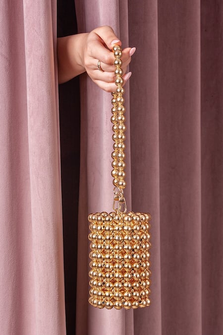 Gold bucket bag handwoven with plastic beads and beaded strap on top. Comes with pouch.