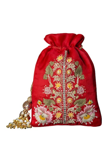 Red potli bag featuring hand embroidered 3D floral-leaf motifs with multi-color thread work