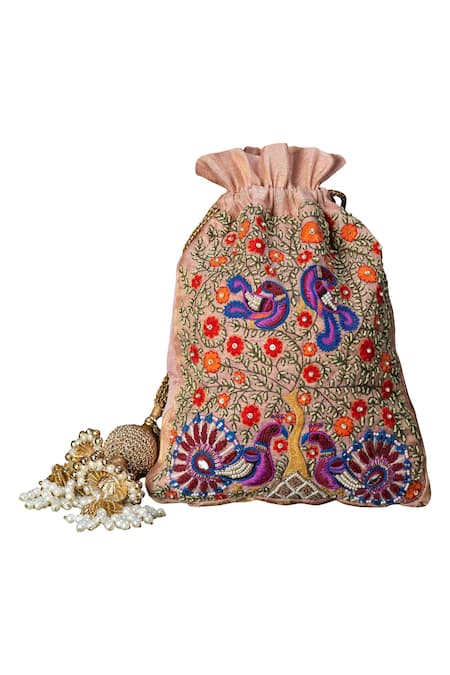 Pink tinted peach potli bag featuring hand embroidered floral-peacock motifs with multi-color thread work and sequin embellishments